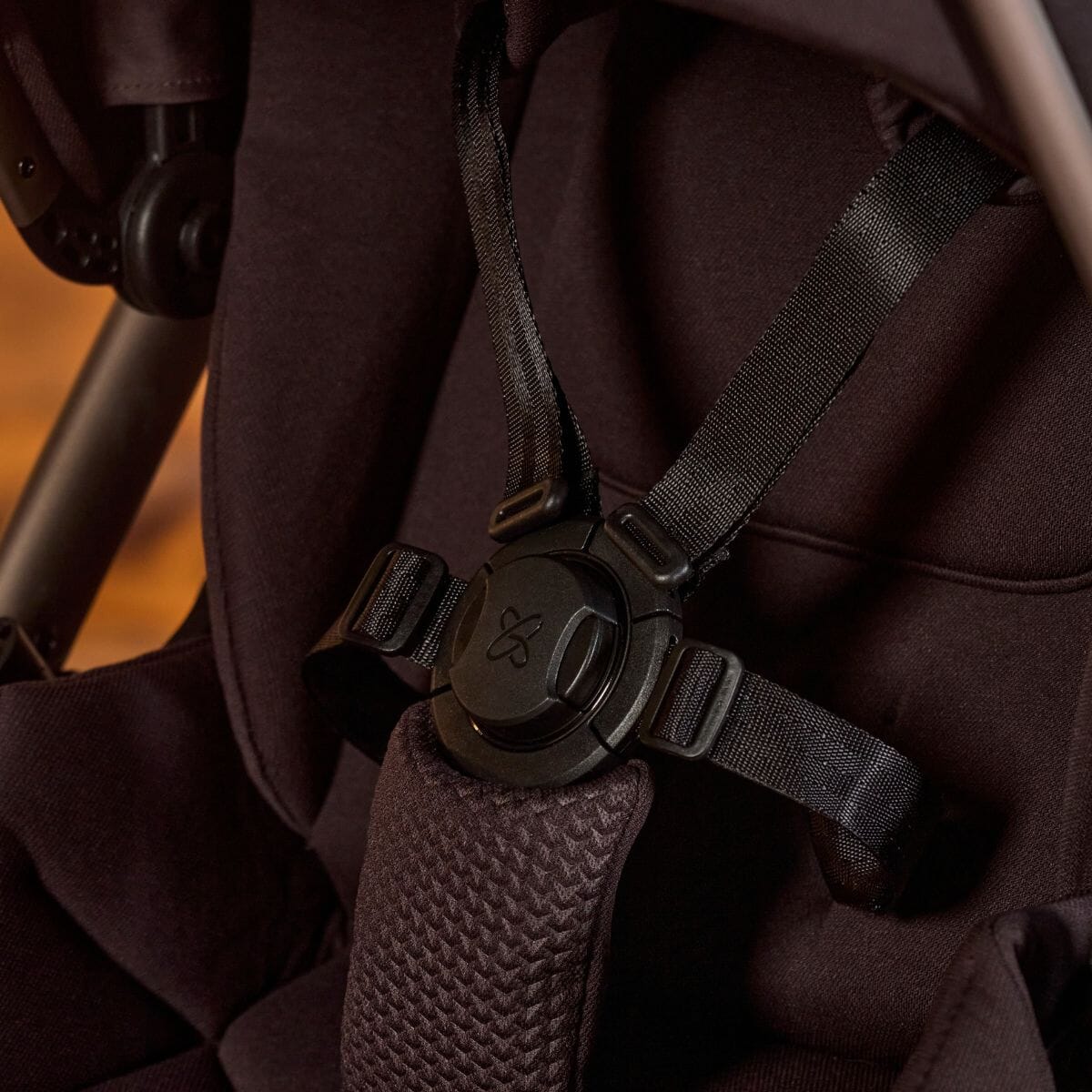 Versatility and functionality are key to this stroller’s design. It offers top-notch maneuverability with enhanced suspension for easy navigation. Multiple configurations allow use with a bassinet*, newborn apron, rear-facing, forward-facing, or as a travel system*. The one-handed fold works in either direction, perfect for parents on the go. The no-rethread harness with the magnetic Genius™ buckle ensures quick adjustments. The adjustable calf support and multi-recline seat provide a fully flat recline for baby comfort. The vegan leather handle stays clean by not touching the floor when folded.
